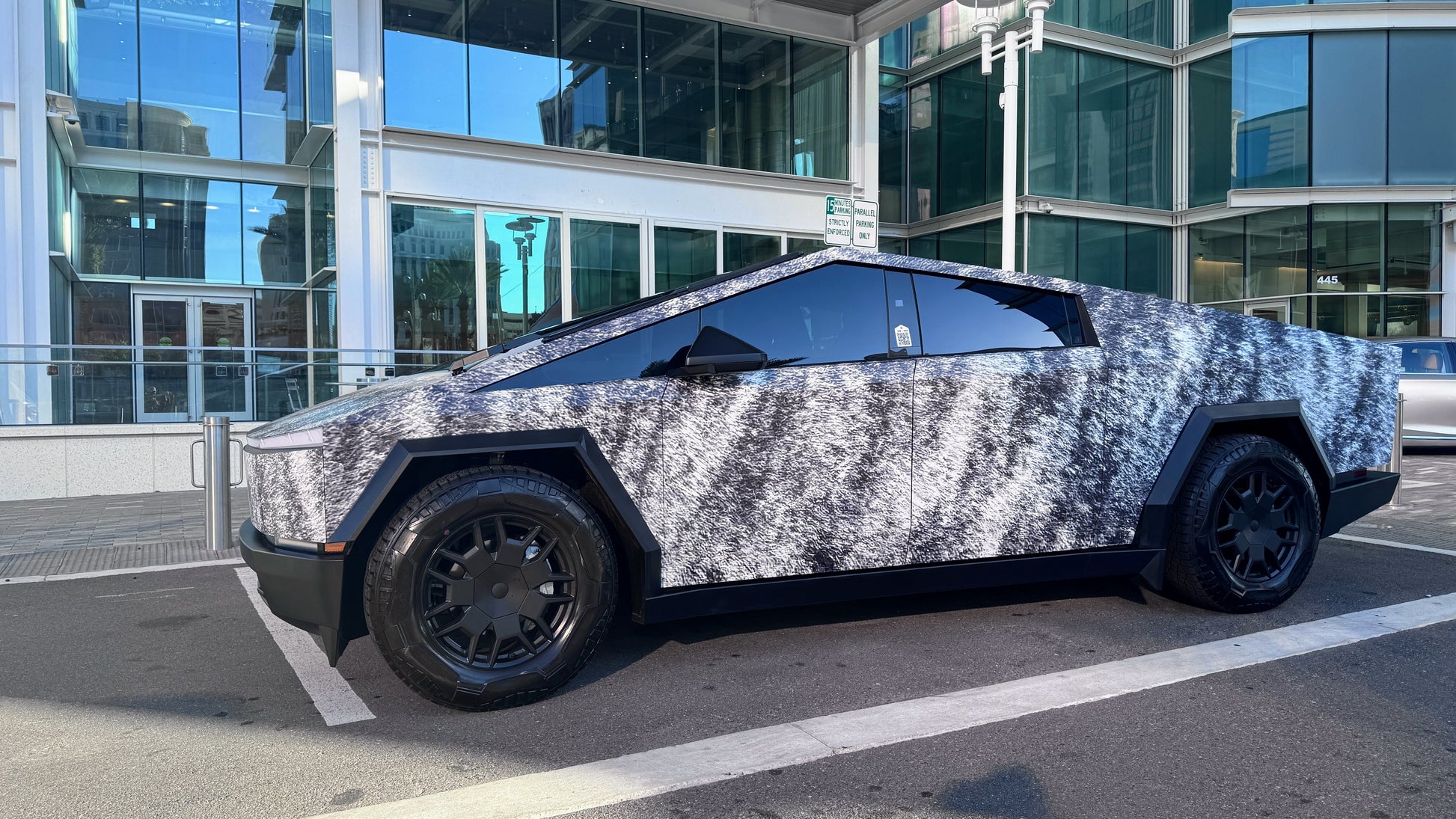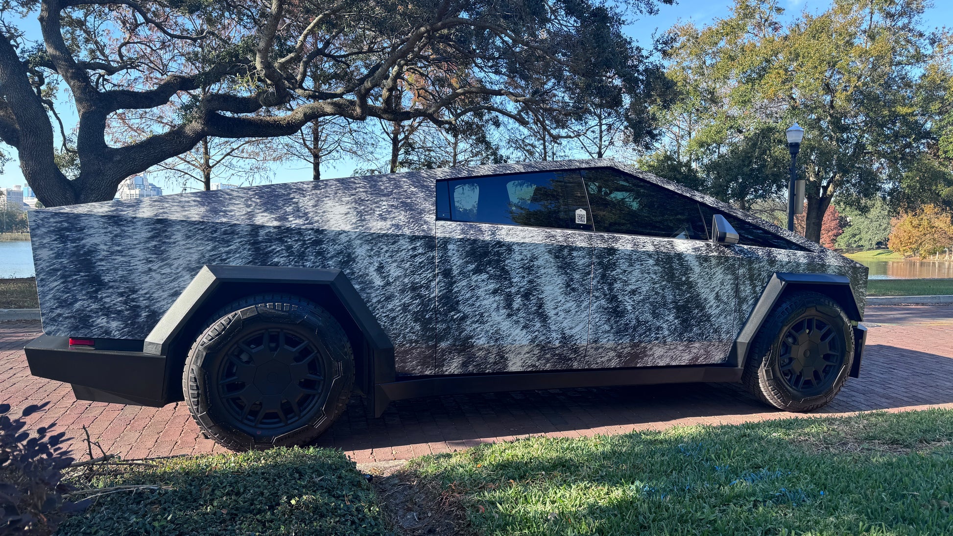 This Brindle Blaze™ Cybertruck wrap is a unique and eye-catching way to customize your vehicle. Inspired by the brindle coat of a Scottish Terrier named Captain Skipper, this exclusive wrap is sure to turn heads wherever you go. Own a piece of Cybertruck history with this limited-edition design!
